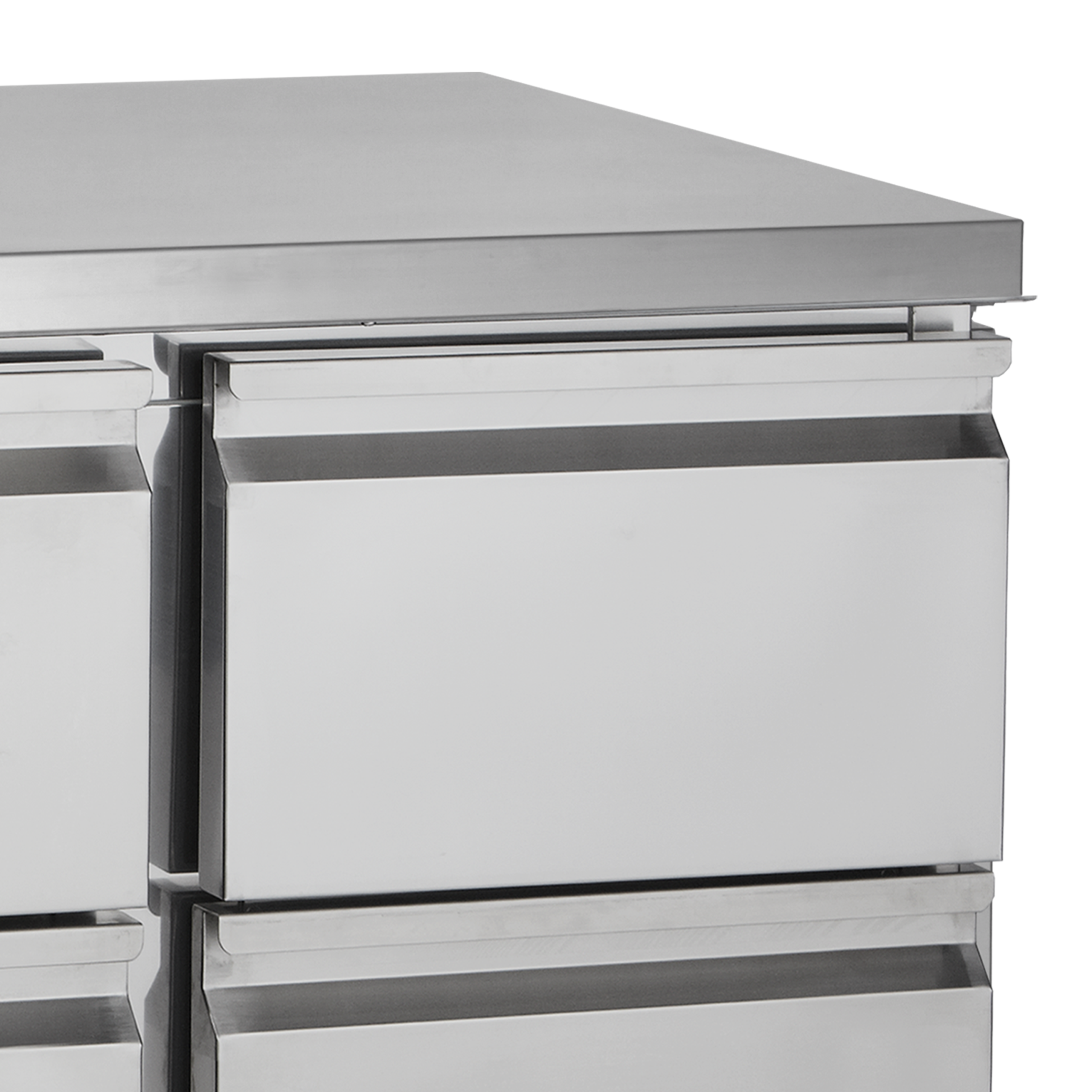 SS er en serie af sandwichborde fremstillet i SS304 rustfrit stål. De er et godt valg til professionelle køkkener, da du har alt, hvad du skal bruge til madlavningen, lige ved hånden. Kølebrønden er velegnet til GN kantiner og skabene giver let adgang til opfyldning. Kølebordene fås i flere størrelser med 2 eller 3 døre.